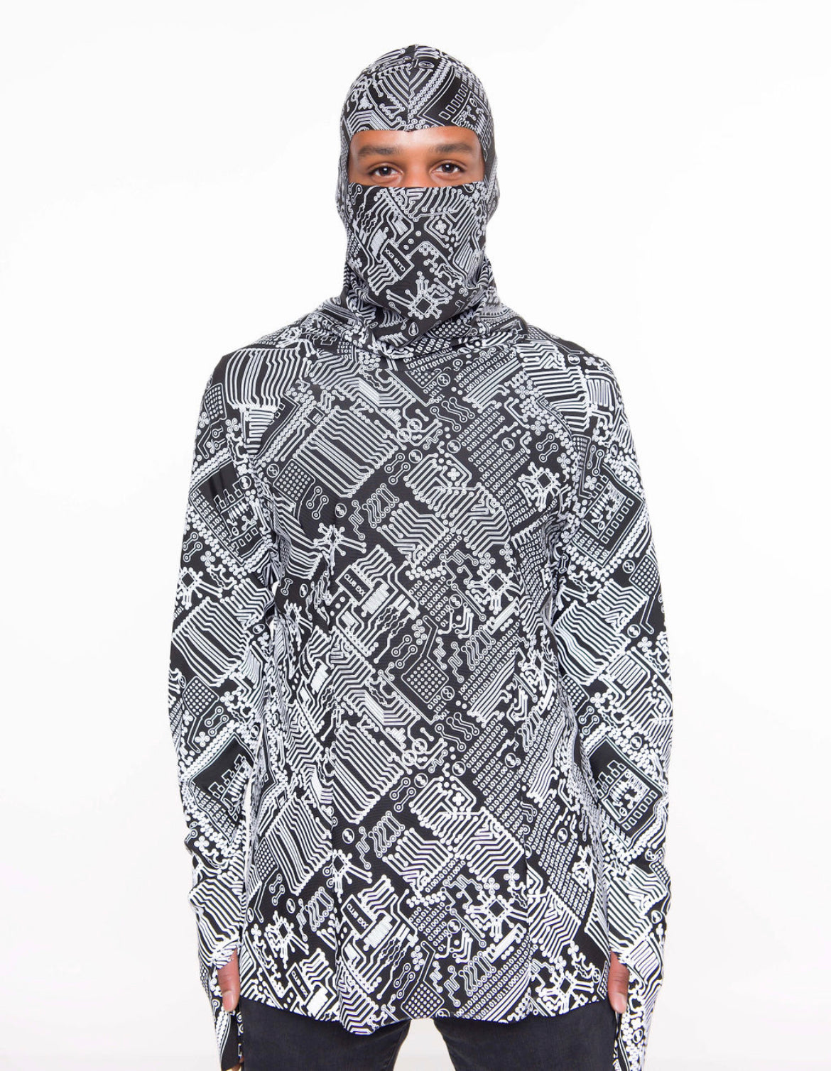 Long Sleeve reflective circuit print shirt with loose turtle neck detail and a thumb cut out to turn into gloves. Mask sold separately.