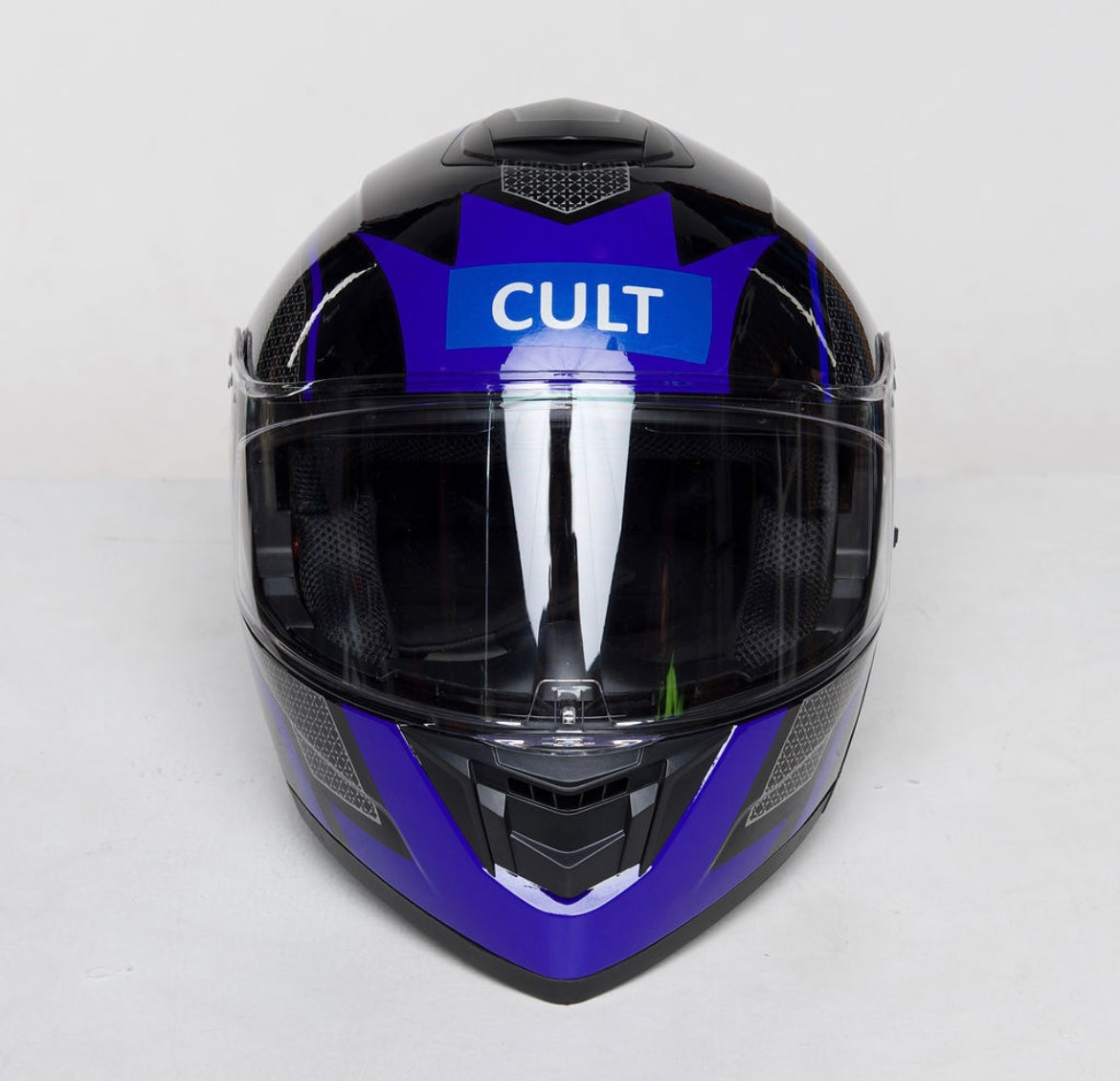 MJR Motorcycyle protective helmet made with Cult logo and tinted shades on the inside